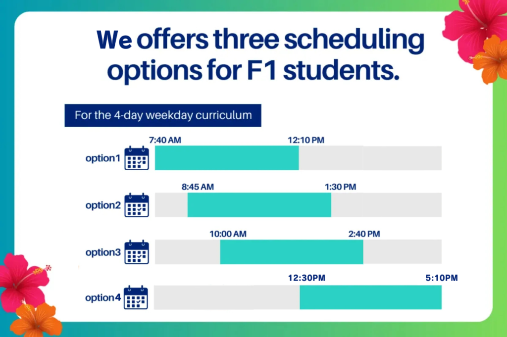 Academiaに通う多くの生徒は、お子様の送り迎えをする親御さんです。4日間の平日カリキュラムには、以下の4つのスケジュールオプションがあります: