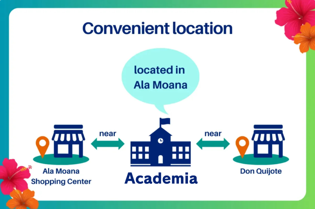 Academiaはアラモアナに位置し、アクセスが非常に良いです。ドン・キホーテやアラモアナショッピングセンターの近くにあり、授業後の買い物に便利です。